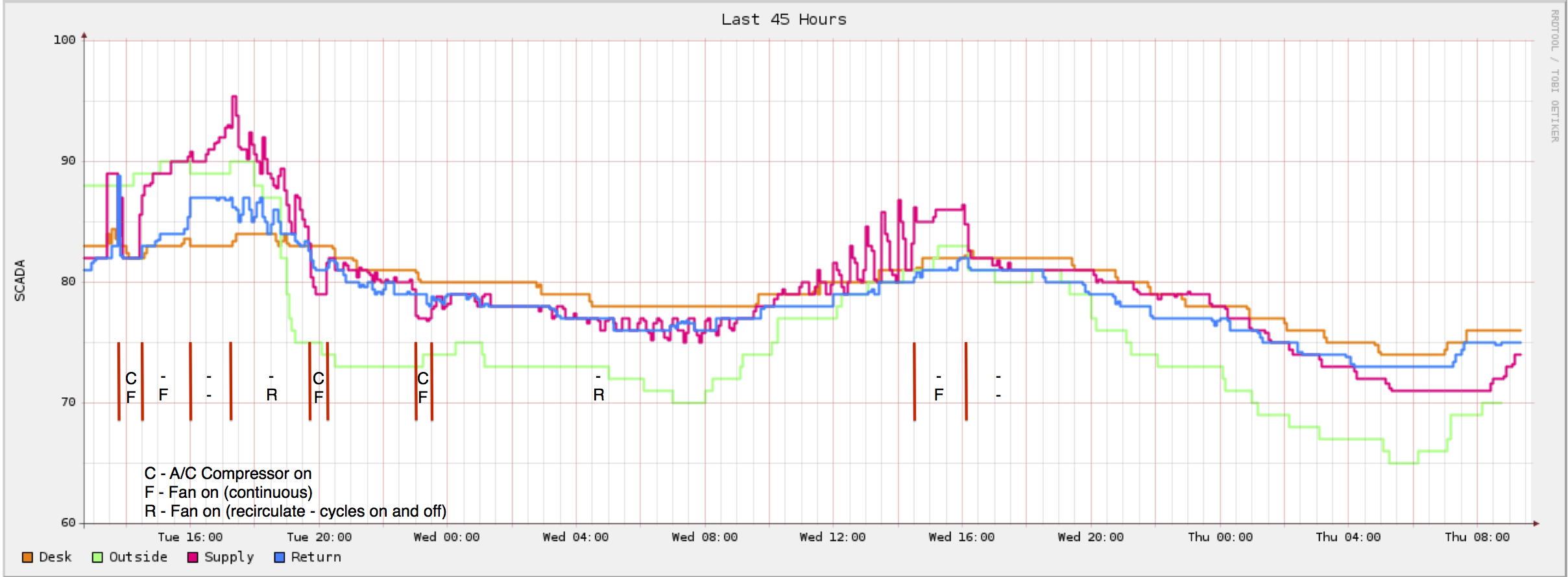 When the compressor ran from about 1:45-2:30 on Tuesday, the supply and return lines were at the same temperature. That is, it showed ZERO cooling effect. When run twice that evening (about 8:00 and again about 11:00) the graph shows 2, maybe 3 degrees of cooling. So, obviously, it’s broken. My long term plan includes emailed and even a beeping alarm unit when this drop habitually reduces below some threshold….so I was glad to see what “broken” looks like so early in the system’s development.