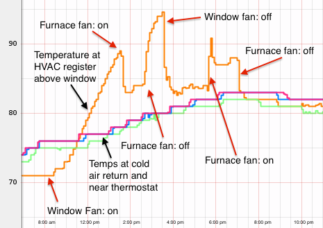 Shortly afterwards, the register temperature climbs steadily, which isn’t surprising given the past data and the fact that this window gets full sun in the morning. Then, just to verify the previous days’ data, I turned the furnace fan to continuous on at about 1:30. The temperature at the register dropped over 5 degrees, but still remained significantly higher than the temperature in the room. I turned it back off, and the line climbed back up to resume the earlier slope. Then I had a crazy idea: What if the window fan was sucking air out of the register? I turned it off, and the temperature plummeted, back to an unsteady 2-3 degrees above the room temperature. Turning the furnace fan back on again resumed the high temperature readings from that register, higher than before, but still consistent with the rising temperatures outside (not shown on this graph). When it was finally turned off, with the window turned off, the temperature fell to match the rest of the sensors in the room.
