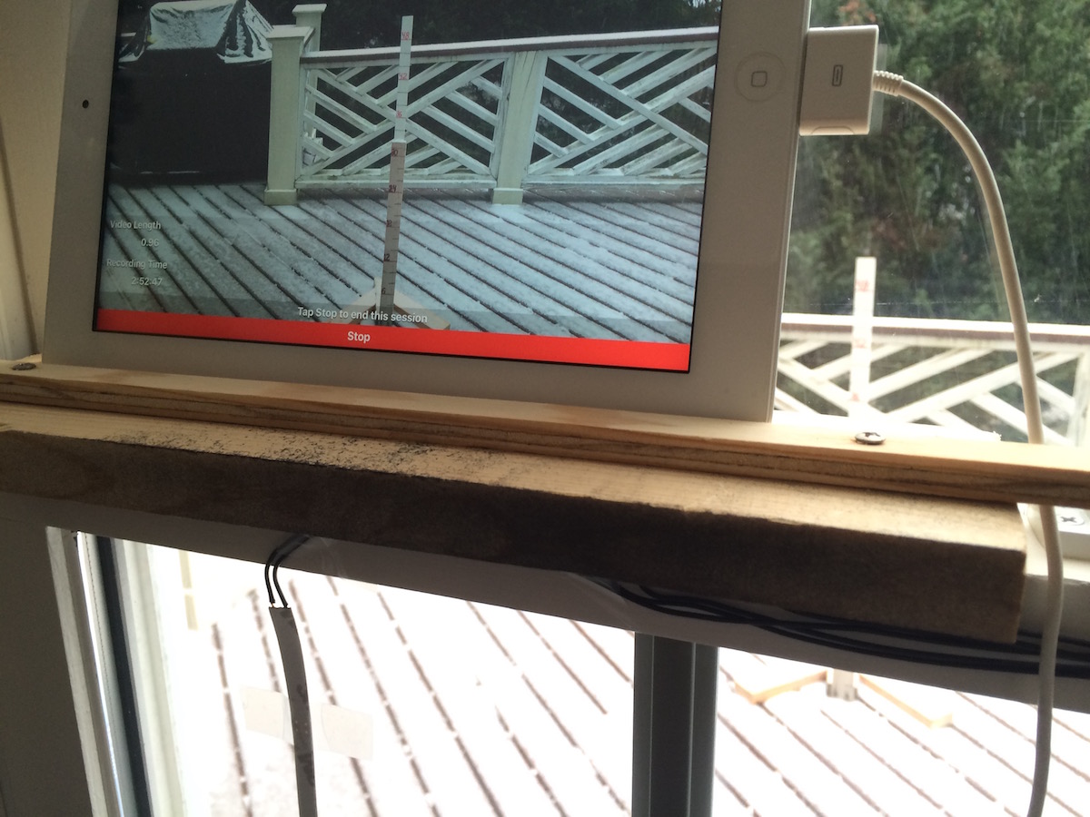 After conceding defeat on the SLR front, I thought, maybe I could find an iOS app to do this. There must be one. And, sure enough, a few minutes of searching led me to TimeLapse, by xyster.net. I grabbed an iPad 3 from my drawer of crazy old iOS devices, installed it, and figured out how to get it established in the window. At first, I planned to simply tape it to the window, but then the image was framed all wrong (it had to be located above expected snow line, if I’m to get anything). But I realized that it’d just barely fit on the frame of the lower sash, and so it was off to the scrap pile to make a little shelf.
