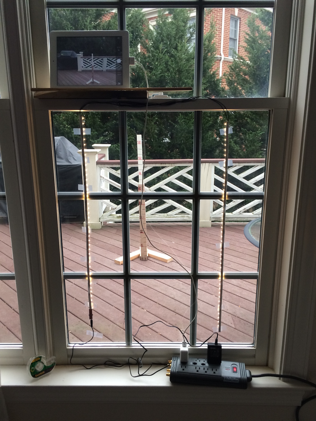 It’s actually screwed into the sash (I’m sure we’ll never notice the holes once it’s gone), though I got a little nervous when doing so that I didn’t drive the screws all the way into the windowpane. Another small strip provides a ridge to keep the iPad from falling off. Just below, you can see the edge of a LED strip I had lying around… I cut it in half, linked the two halves together, and taped them to the window, facing outwards. When we tried this light last night, it was strong enough that the snow stick cast a shadow, so hopefully that’ll be enough to keep taking pictures overnight.
