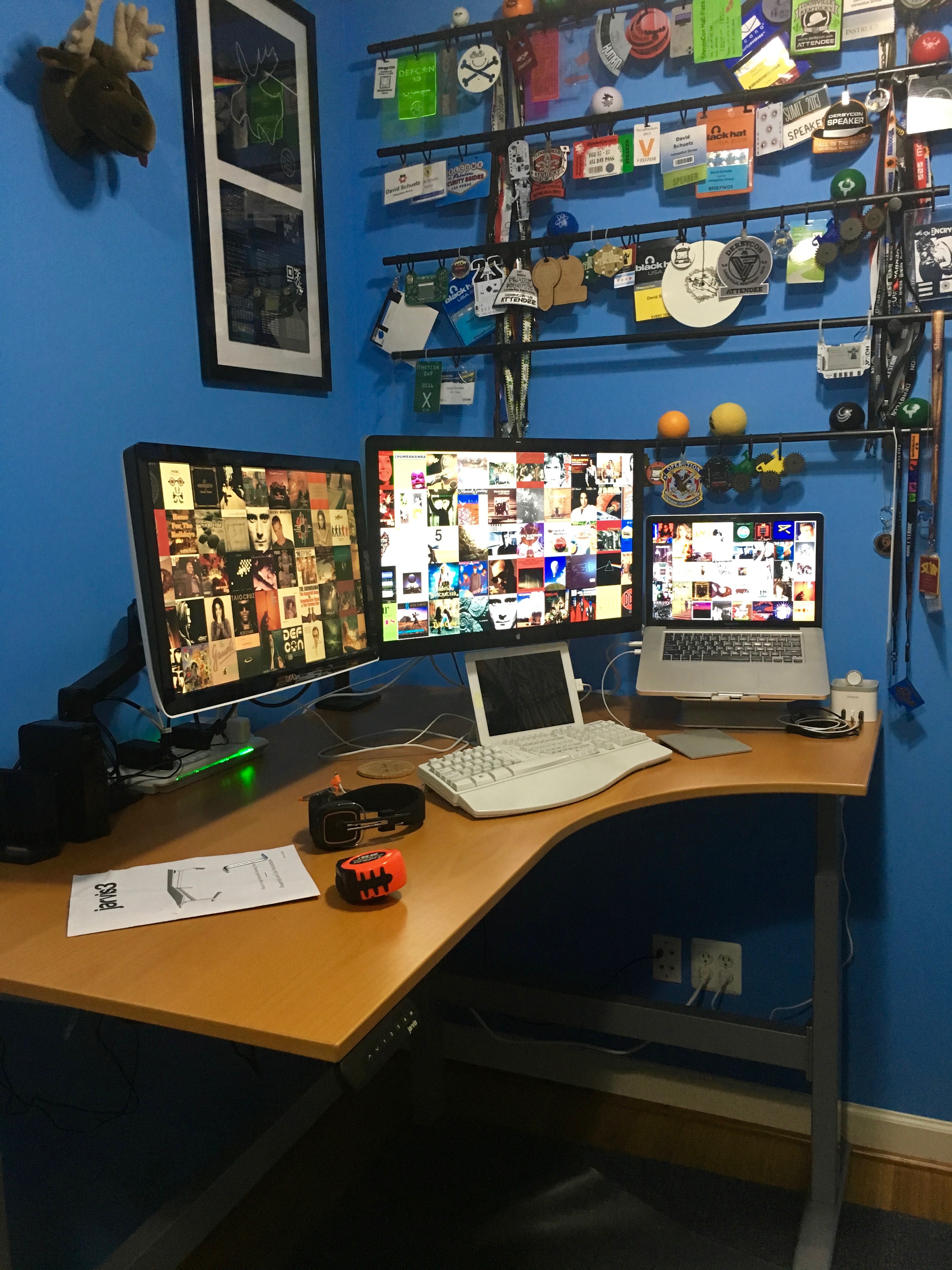Then a couple months later, The Wirecutter posted a review of standing desks, and their top pick was the Fully Jarvis Bamboo desk. Unfortunately, that was a little too small for the large collection (2 monitors plus the laptop screen, plus various other stuff) I had on my IKEA Gallant corner desk. However, they sell an L-shaped version, the Jarvis J3. And it’s available as just the frame, so I can even keep my desktop.