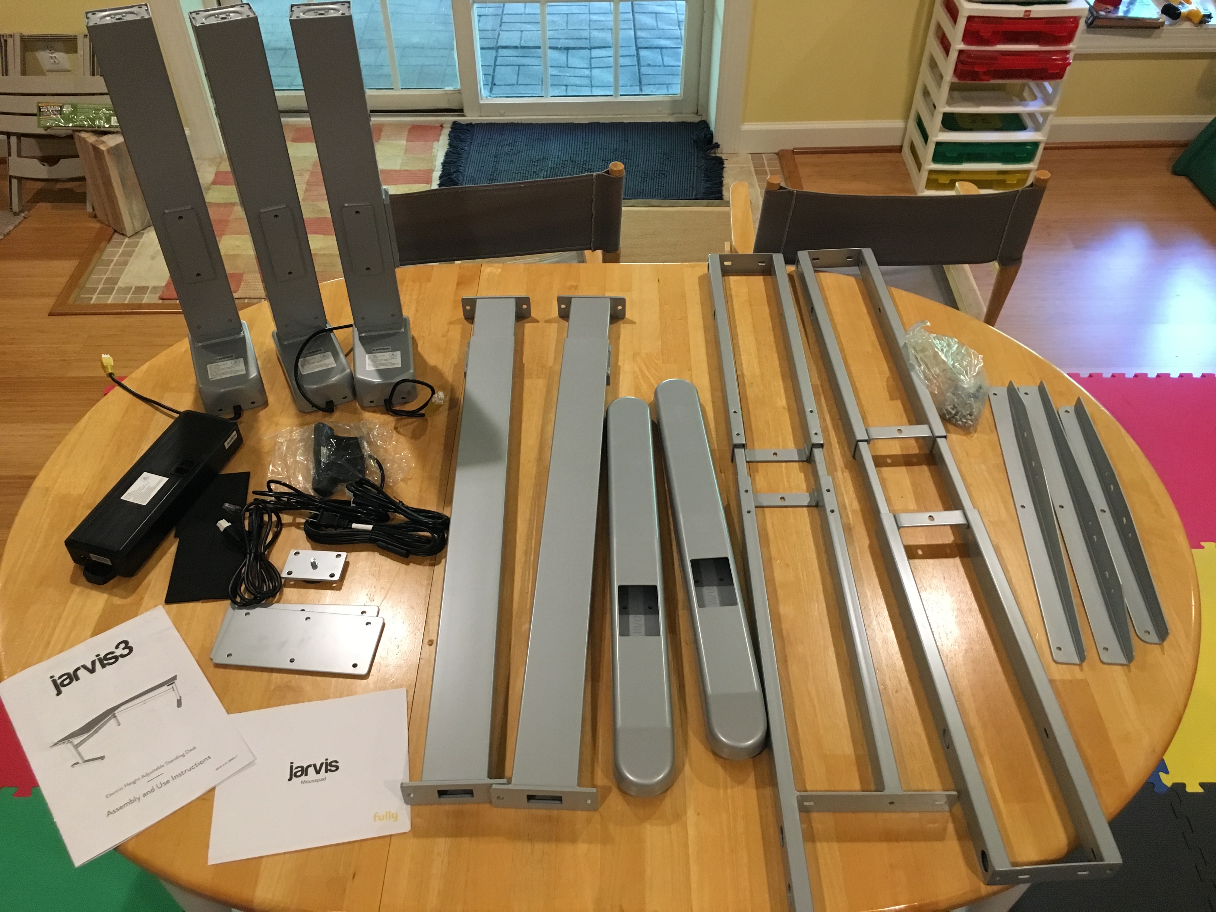 It’s heavy. The desk frame arrived in two largish cartons (about 10 x 12 x 40”), weighing about 60+ pounds each. I unpacked the boxes and brought everything downstairs.
