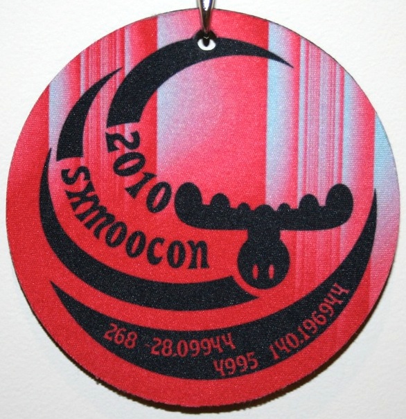 The badges this year were little round foam/rubber coasters. They featured a Moose head, “2010 Shmoocon,” and four sets of numbers. These numbers were the puzzle, but they weren’t exclusively on badges: 5 other sets of numbers were hidden in plain sight elsewhere in the conference.