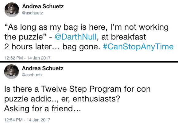 - For six puzzles, my contribution was mostly “Oh, that looks like X” and the rest of the team knocked it out completely without me (though I finished one when the person working it had to stop due to a dead laptop battery).