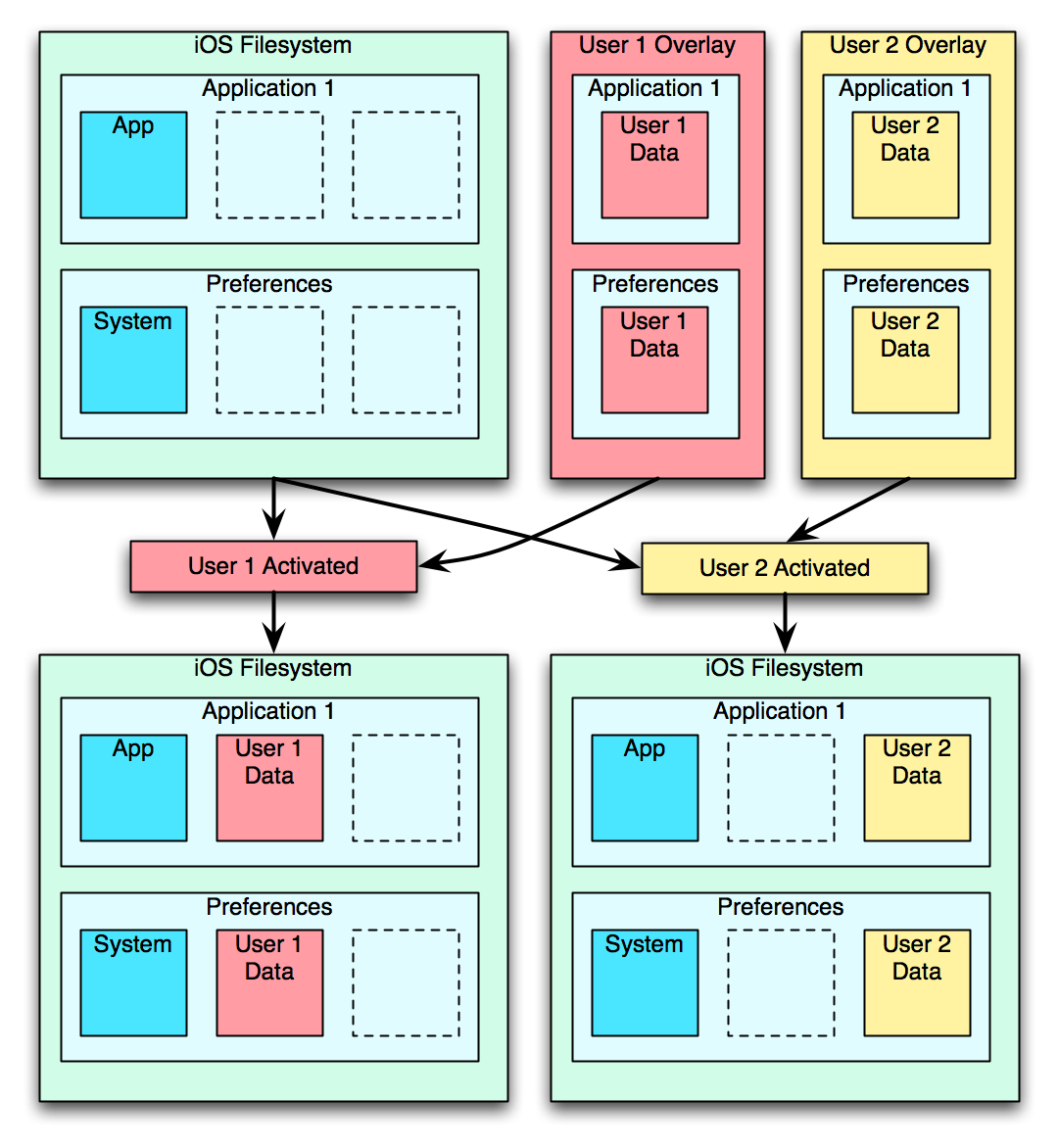 The device simply puts all the Documents folder into a separate filesystem, then depending on which user has been activated, takes that filesystem and merges it with the base filesystem, overlaying the folders back into their proper locations. So to the device, to the apps, it’s as if nothing has changed. Data’s where you expect it to be.