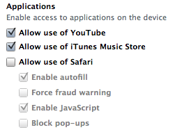 When deploying iOS devices, such as the iPhone or iPad, to a corporate population, the security-minded may ask “how can we keep people from using this device for inappropriate web surfing?” The easy answer is to use the restrictions available via profiles. This can be readily accomplished through a configuration profile that disallows Safari. The profile is easiest to create using the iPhone Configuration Utility the iPhone Configuration Utility (IPCU). It can then be installed on the device via the IPCU directly (usingUSB) or through a Mobile Device Management (MDM) system. Disabling Safari is simple: Just remove the checkbox next to “Allow use of Safari” and push the configuration to the target devices.