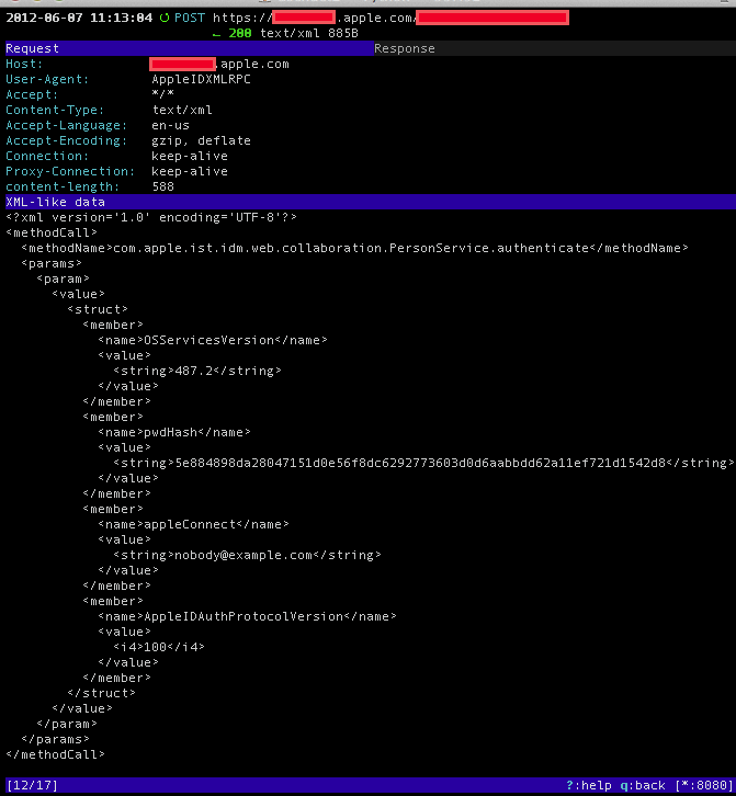 You might also notice a complete lack of any other session-related information in the HTTP header or in the submitted XML. There’s nothing else for the server to go on, other than this hash and the accompanying AppleID.