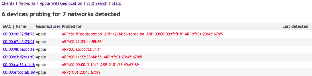 Clients detected, and the APs they queried for (anonymized, obviously)